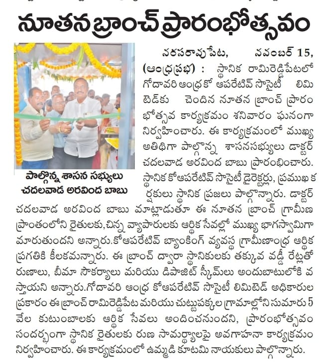 We are delighted to share that the inauguration of our new branch @ NARASARAO PET has been successfully completed. Our Honorable MLA Sir Shri.Chadalavada Aravinda Babu Garu (Constituency of Narasaraopet Pet) inaugurated on 15-11-2025. This milestone marks a new chapter in our journey, and we look forward to serving our customers with greater dedication and excellence.
